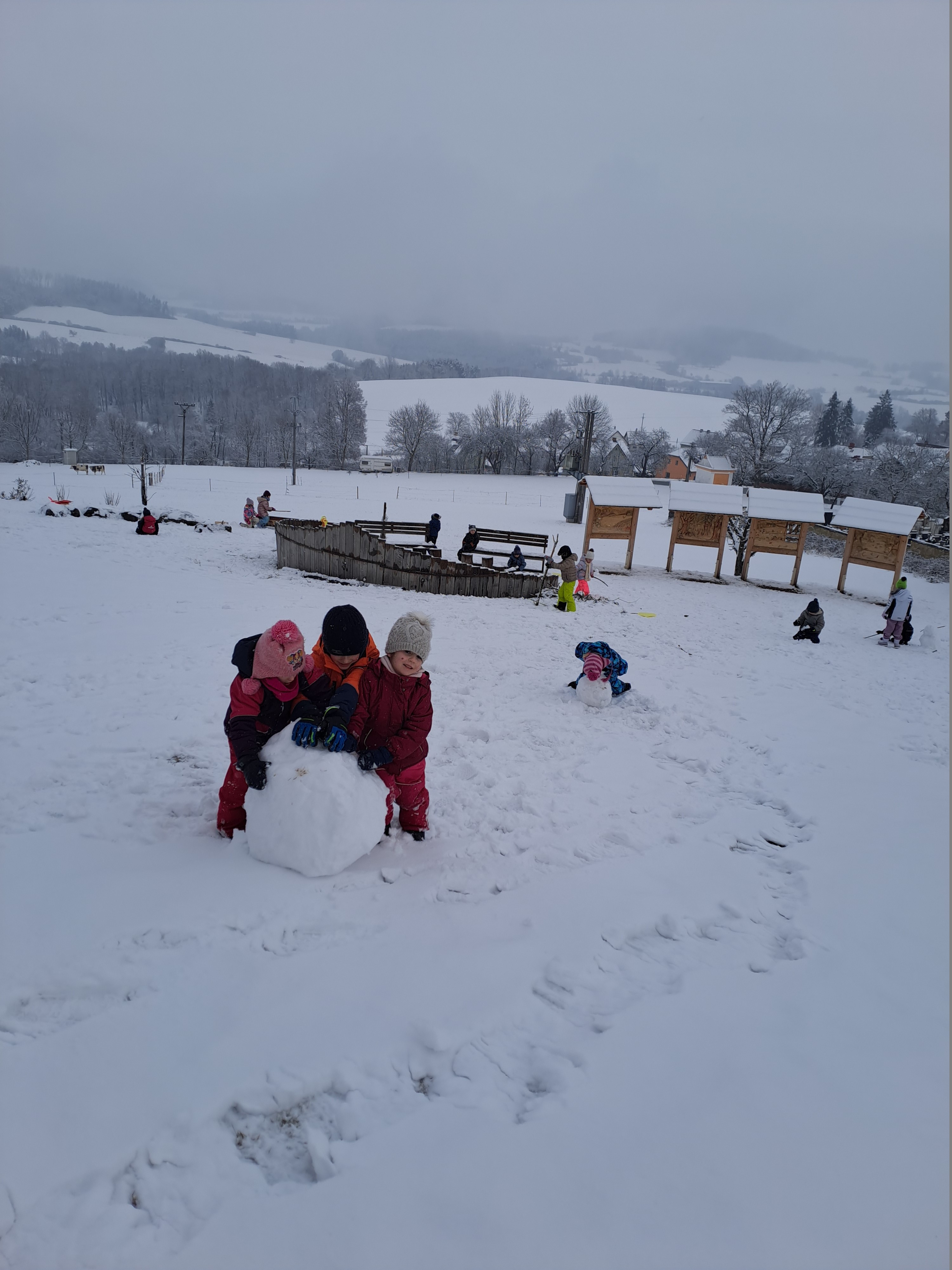 Dopoledne i odpoledne jsme vyrazili jsme ven na pořádnou klouzačku. Sníh si opravdu užíváme. Bobujeme, stavíme sněhuláky. Někdo se pustil i dokonce do větších staveb ze sněhu a vytvořil přímo sněhovou pevnost. Čaroval