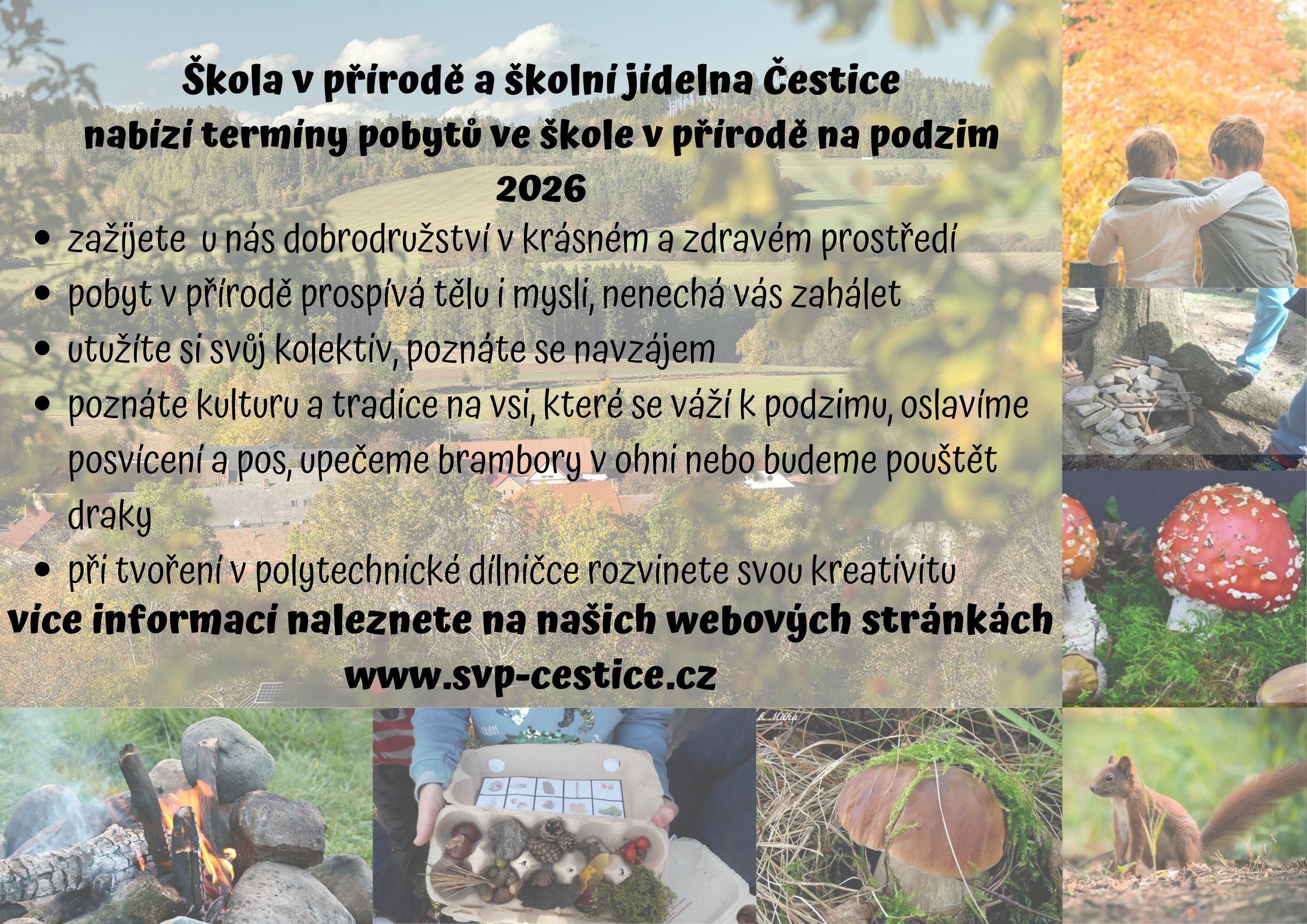 Už dlouho jsme o sobě ze Školy v přírodě v Česticích nedali vědět. Podzim je krásné období. Obarví se pestrou paletou barev a my jen žasneme, co všechno příroda dokáže. Podzim nám nabídne i nepřeberné množství pokladů, ze kterého lze tvořit jedna radost. To všechno si děti na pobytech u nás v ŠvP užily. Zdravíme všechny z Čestic...