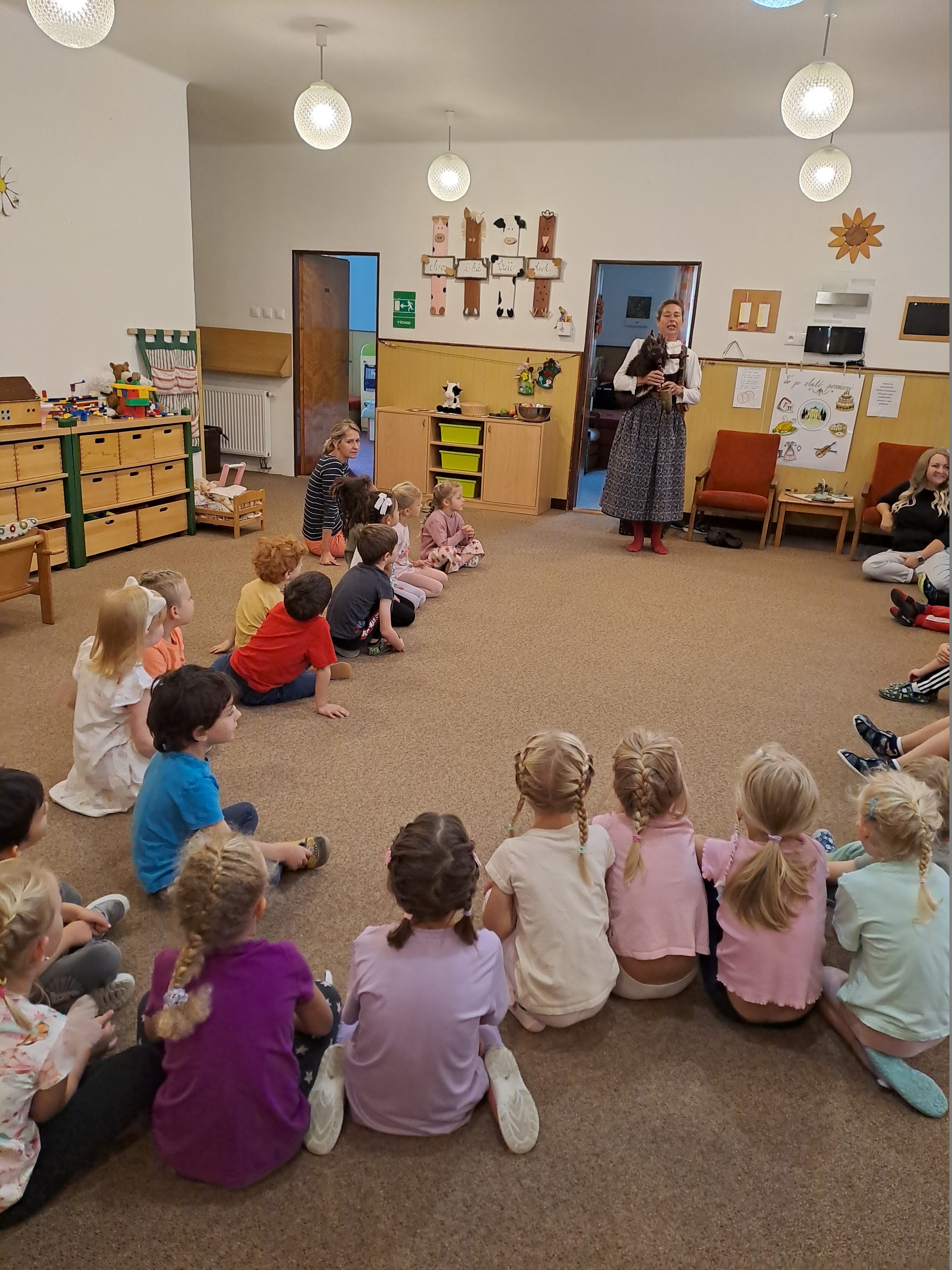 Děti si svou hnětýnku také nazdobily a odvezly domů do Prahy a ta posvícenecká tancovačka také byla. Dětem přišla zahrát dudačka, s paní učitelkami jsme si zazpívaly a zatancovaly.