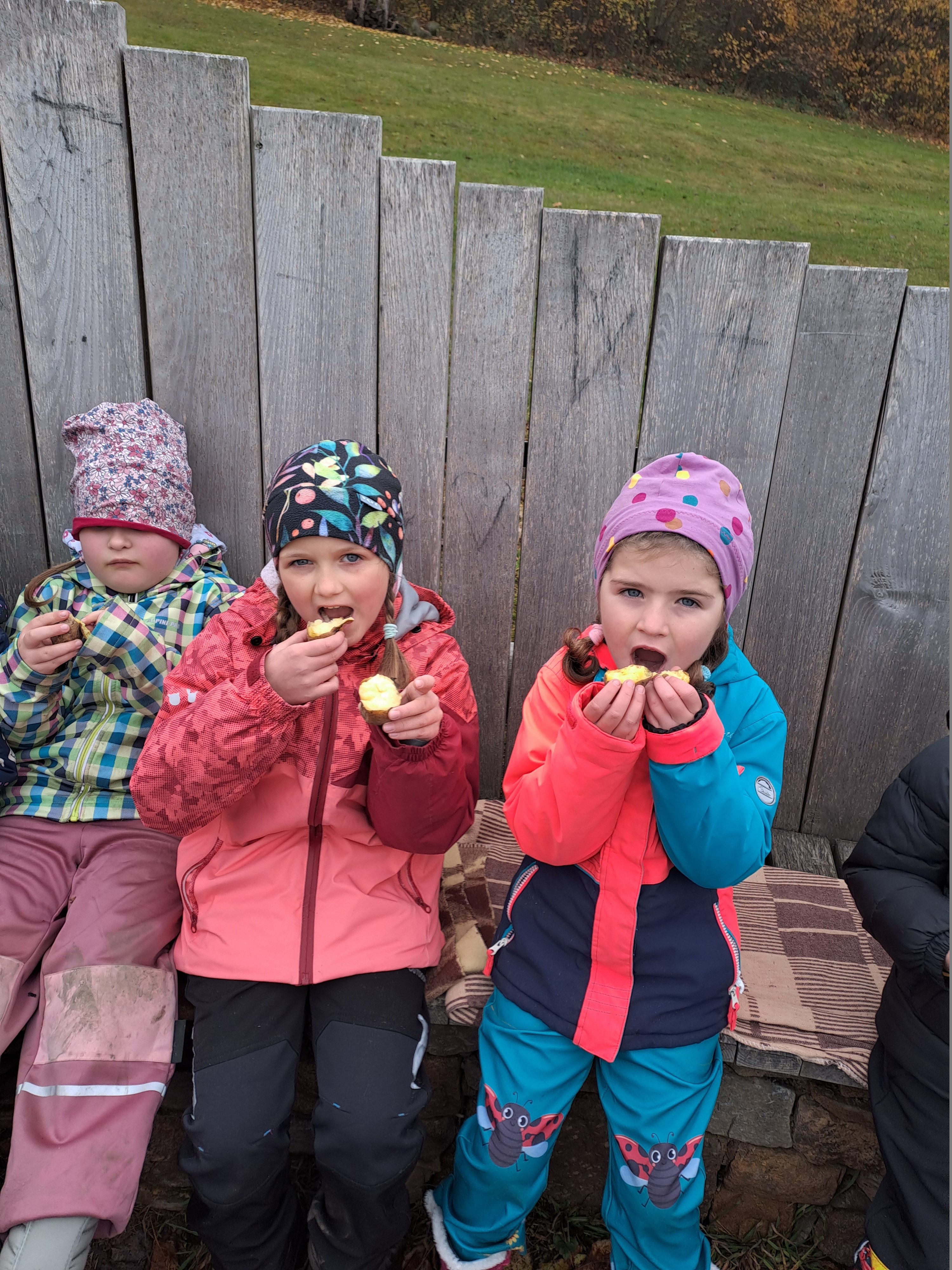 Během pobytu si všichni užívali nejvíce pobytu venku v lese nebo na výletech. Děti z MŠ Masné se při jedné procházce vyrazily podívat se na pole. Pole bylo již sklizené a přece jen se tu a tam objevilo pár brambor, které na poli zůstaly. Na chvíli si zkusily, jak se dříve žilo dětem. Nebylo to jen tak, stálo je to nemalé úsilí. Nejprve nasbírali brambory do košíku, rozdělaly s paní učitelkou ohýnek a chvíli čekání si zkrátily hrou a zanedlouho už si pochutnávaly,tak jako za starých časů, na pečených bramborách. Někomu chutnaly, někomu méně, zato každý poznal kouzlo podzimních dob jako za našich dědů a babiček.