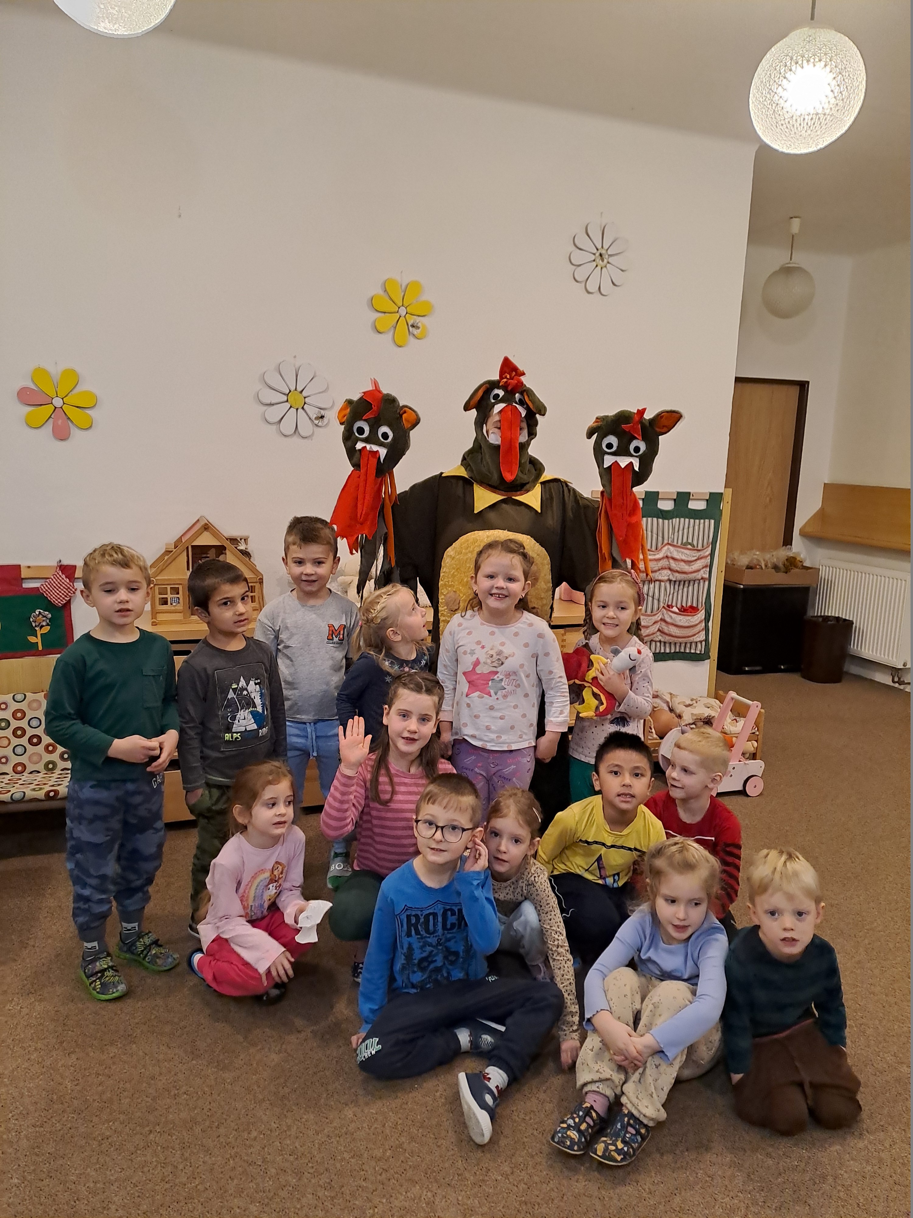 Také jsme měli odpoledne divadelní představení a hráli spoustu her. Oblékali jsme se na rychlost, proplétali provázek na rychlost. Moc nás to bavilo.